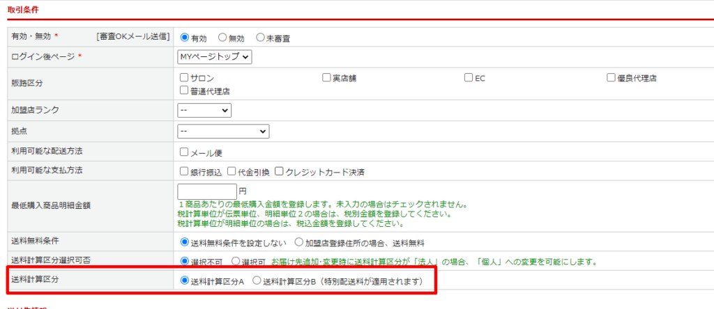加盟店>加盟店登録>「アカウント情報」タブ 取引条件欄