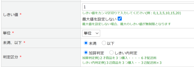 プルダウンより特別配送ルールを選択、右の単位欄には「1」を入力し登録してください。