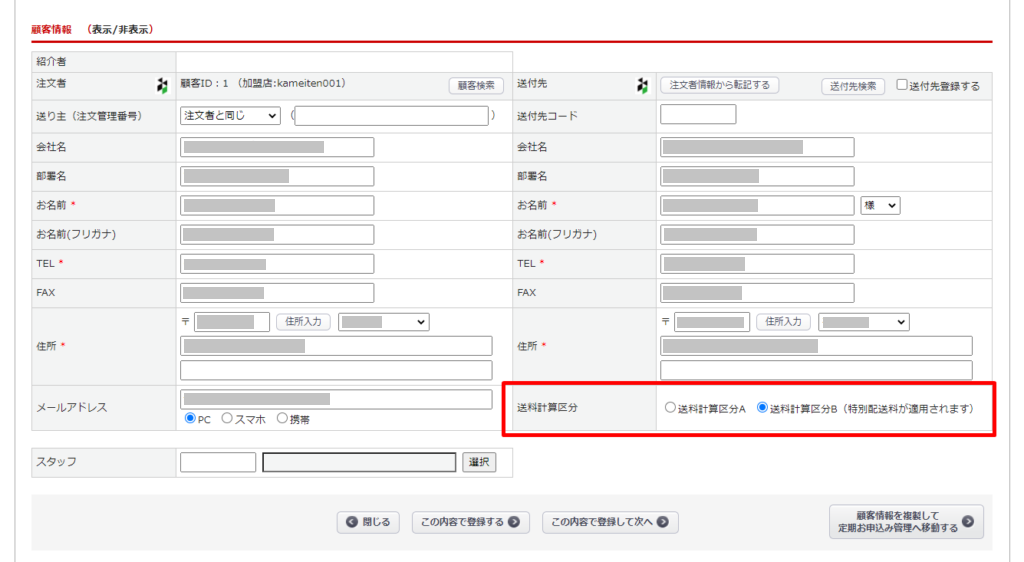 すべての配送先に特別配送料設定が適用され、温度区分別の受注分割が可能となります。