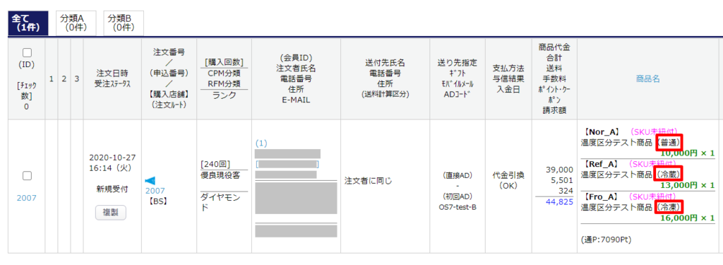 例として、3種類の温度区分が紐づいている商品を同時に購入した以下の受注を分割します。