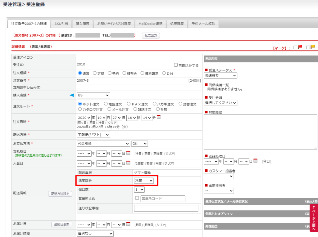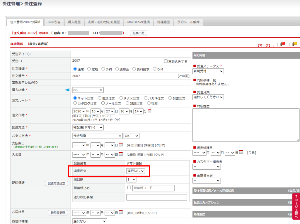 特別配送料設定が適用される送料計算区分の場合、温度区分別の受注分割が可能となります。