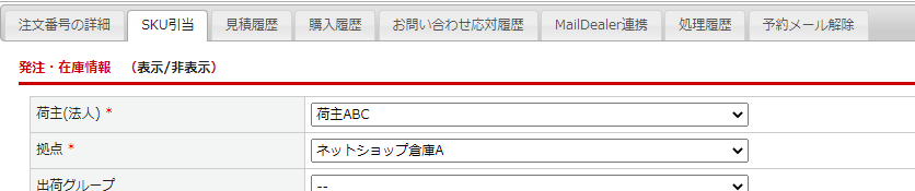 | 出荷グループ | 受注商品に紐づく出荷グループを設定します。 ※システム設定>マスターデータ管理>プルダウン内 「受注管理:出荷グループ」 にて登録された出荷グループの選択が可能です。 ※出荷グループは『一体型帳票機能』もご利用の場合に活用します。 (『在庫オプション』だけのご利用では活用しません。) ご利用をご希望の場合は、サポートまでお問い合わせください。 |