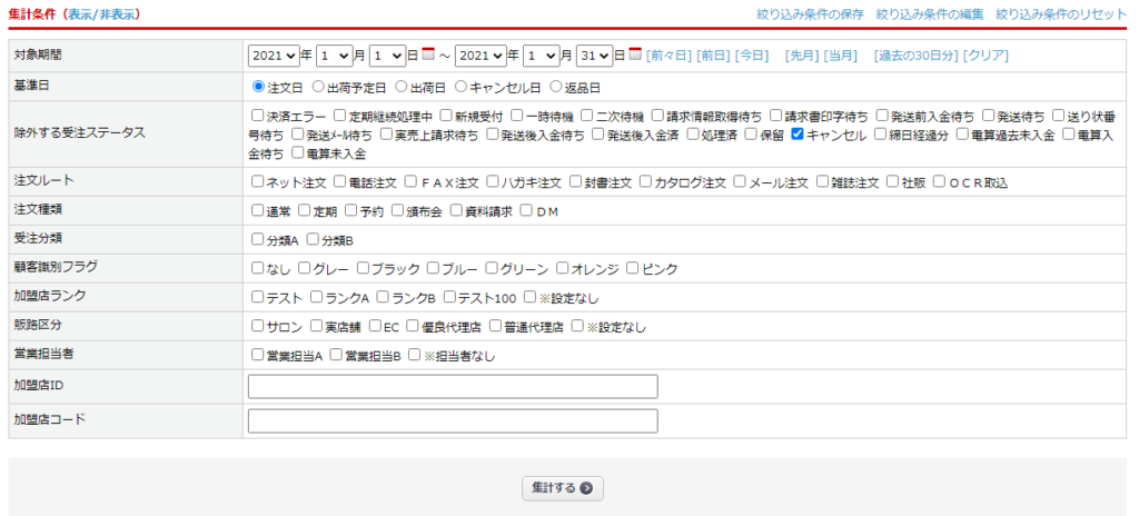 | 基準日 | 対象期間の基準とする日を設定 注文日:注文日が対象期間内の受注データを集計対象とします。 出荷予定日:出荷予定日が対象期間内の受注データを集計対象とします。 出荷日:出荷日が対象期間内の受注データを集計対象とします。 キャンセル日:キャンセル日が対象期間内の受注データを集計対象とします。 返品日:返品日が対象期間内の受注データを集計対象とします。 |