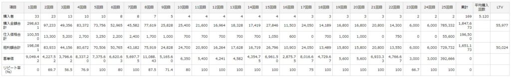 購入回数(1回目~25回目)ごとの売上データやリピート率の推移が表示され、対象期間のLTVが表示されます。