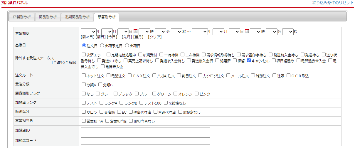 | 対象顧客 | 全て、純新規のみ、商品新規のみ、のいずれかを指定 商品新規… 対象期間にその商品を初めて購入した人 純新規… 対象期間に初めて店舗で購入した人 |