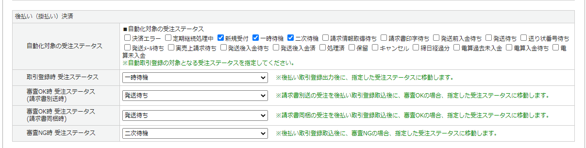 自動取引登録の推奨ステータスは「一時待機」以降、自動出荷登録の推奨ステータスは「発送後入金待ち」以降です。