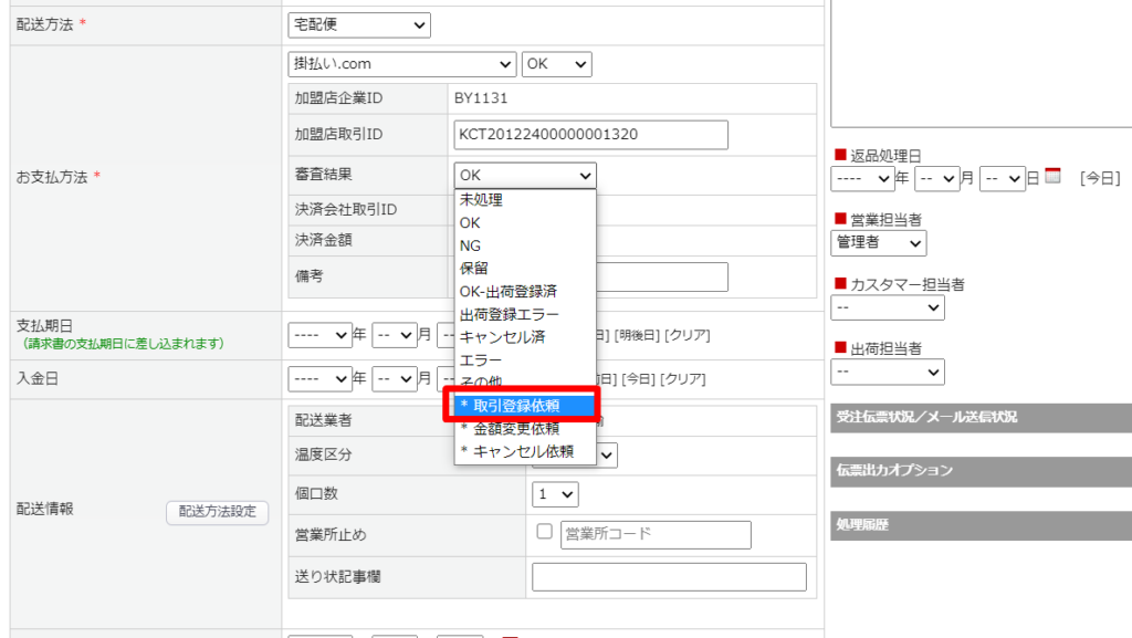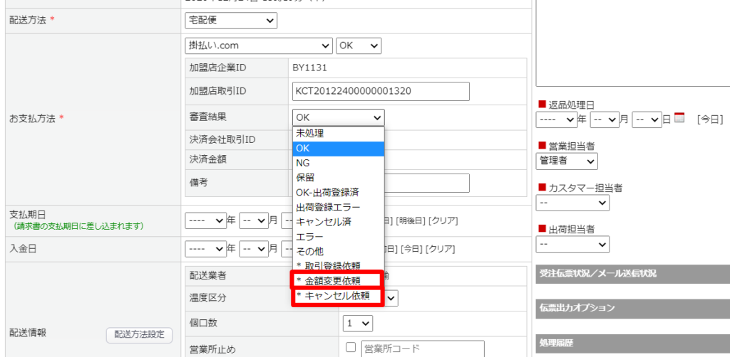 受注登録画面には、お支払方法欄に、連携に必要なID(加盟店企業ID、加盟店取引ID、決済会社取引ID)情報や審査結果が表示されます。
