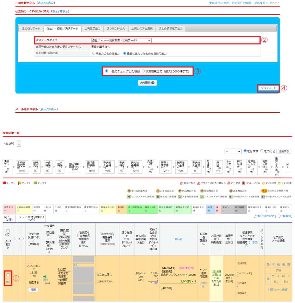 伝票出力・CSV出力パネル>「後払い決済データ」より、一括での取引登録、出荷報告が可能です。