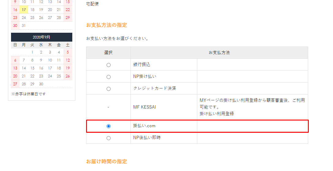 商品購入時、支払方法で「掛払い.com」を選択し、商品を購入します。