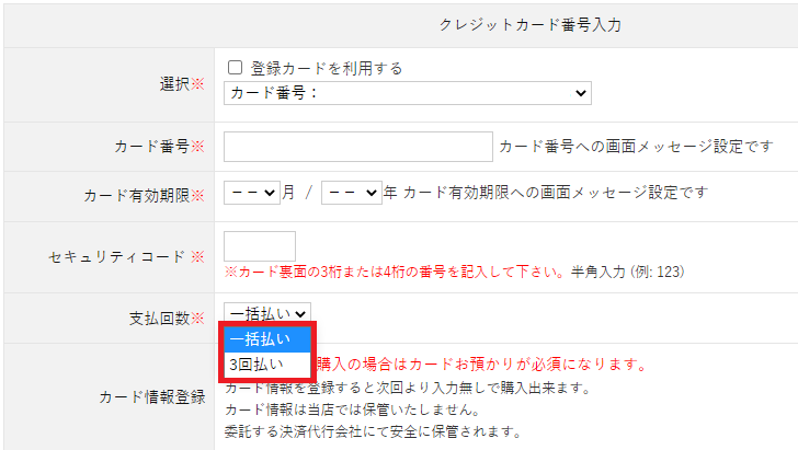 項目の [支払回数] で、有効にする回数を選択して下さい。
