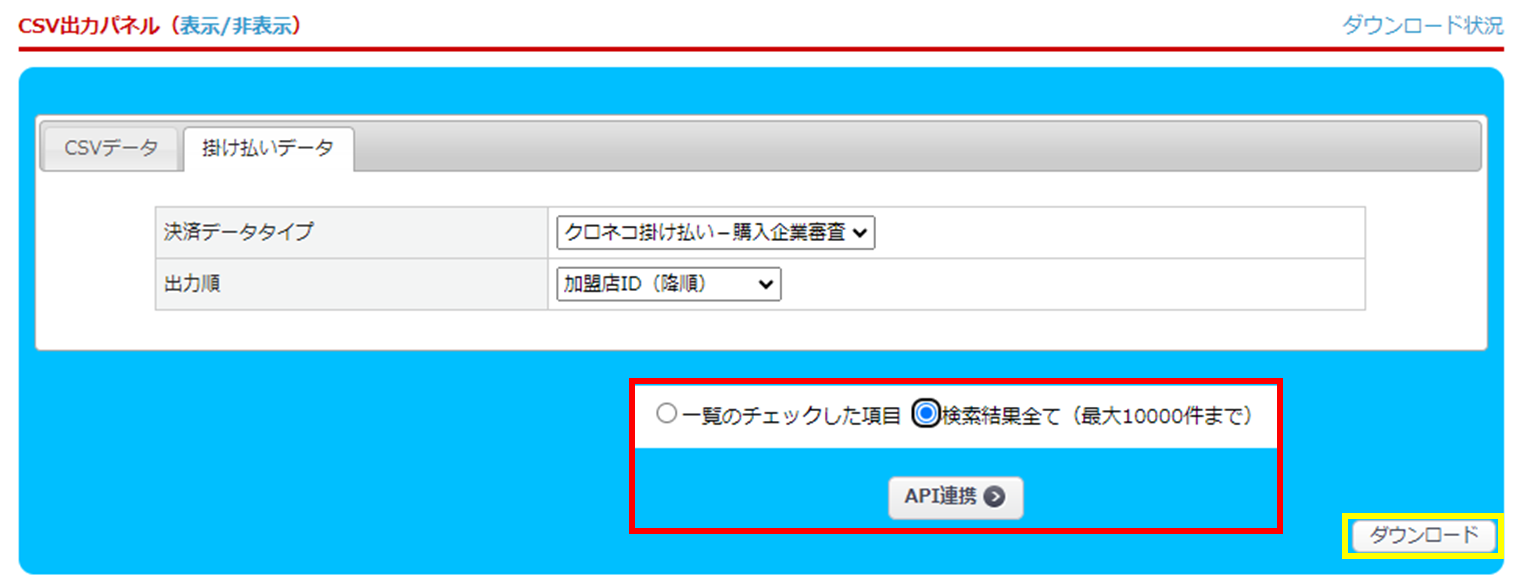 黄枠:「クロネコ掛け払い」側の管理画面からCSV取り込みによる利用審査を行いたいときは、【ダウンロード】をクリックします。