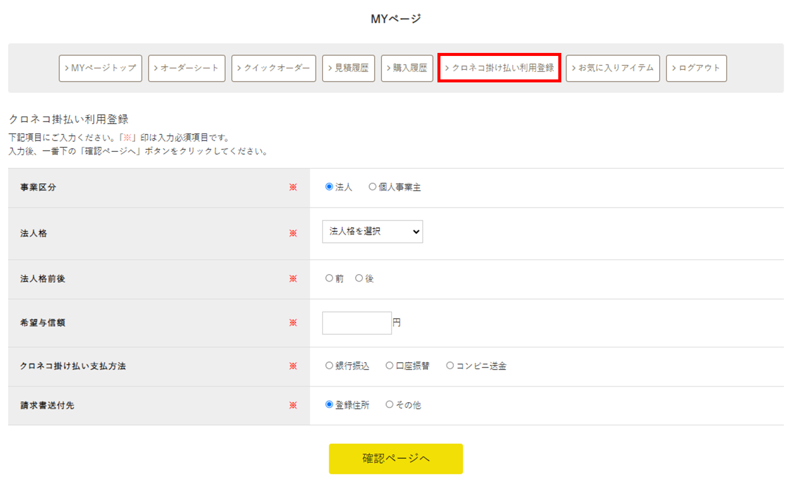以上で、新規登録画面にクロネコ掛け払いの利用審査に必要な項目が表示されるようになります。