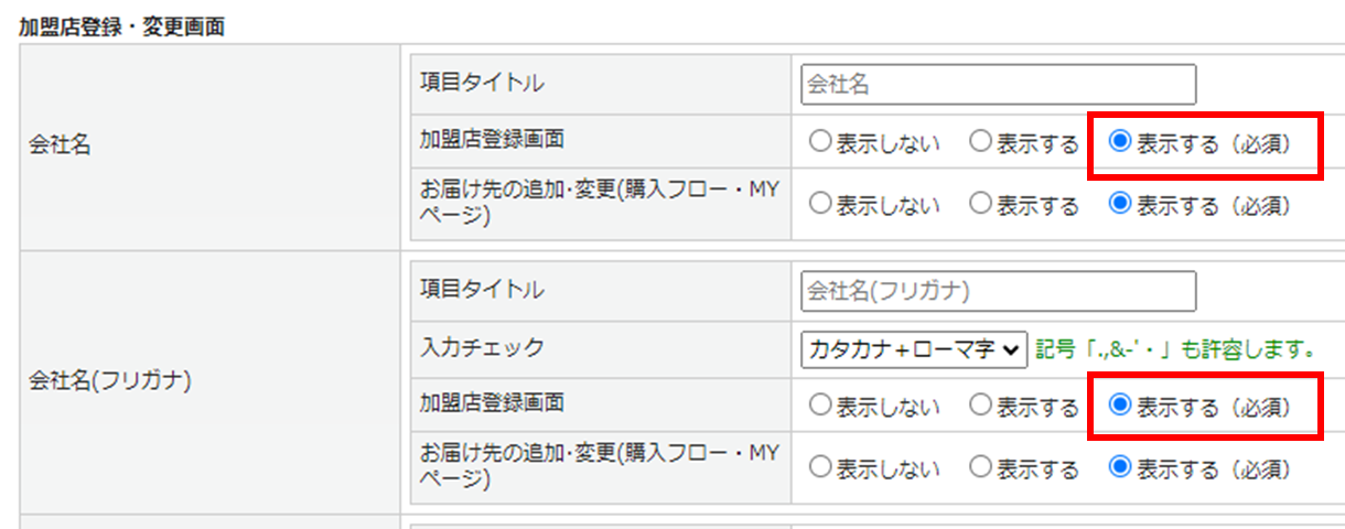 「表示しない」または「表示する(=任意登録)」に設定しないよう、ご注意ください。