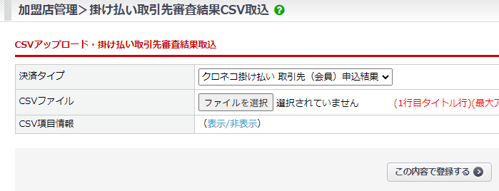 加盟店 > 掛け払い取引先審査結果CSV取込 より、クロネコ掛け払い管理画面からダウンロードした