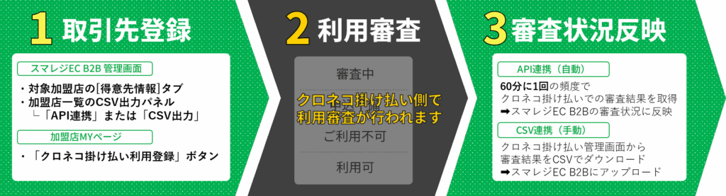 加盟店が支払い方法「クロネコ掛け払い」を利用するには、クロネコ掛け払い側の審査が必要です。