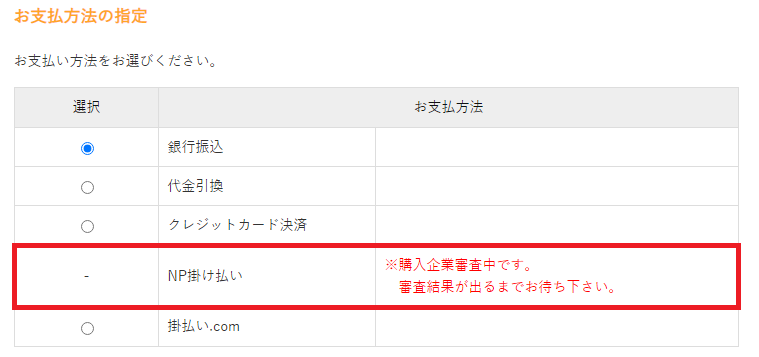 ■お支払方法・お届け時間等の指定画面 NP掛け払い未審査時文言