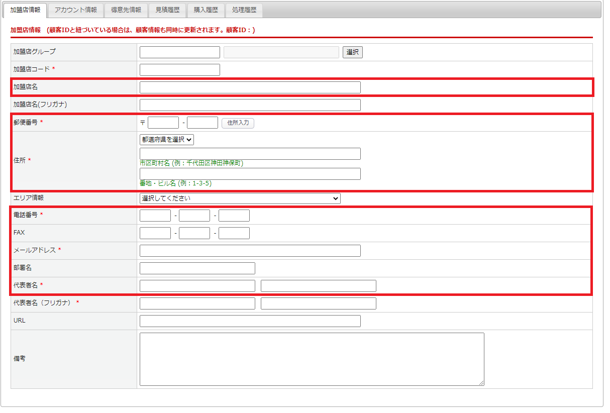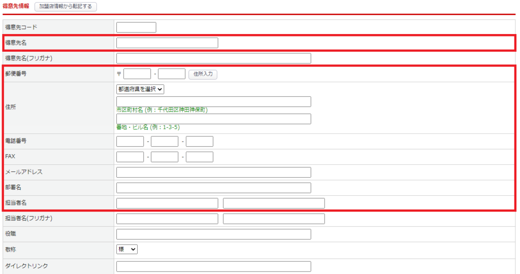 審査完了後に加盟店・得意先情報(以下の赤枠で囲んだ項目)を変更した場合、購入企業修正依頼を行っていただく必要があります。