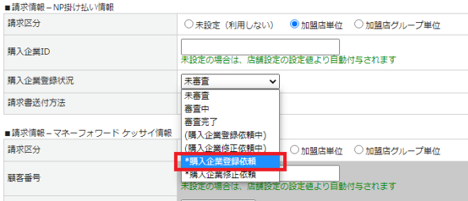 加盟店グループ単位:属している加盟店グループ単位で購入企業登録依頼を行います。