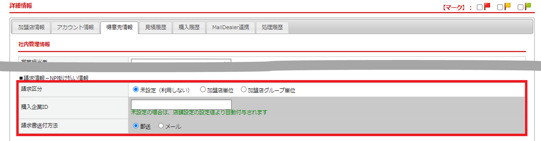 加盟店 > 加盟店管理 > 対象加盟店の編集画面 >[得意先情報]タブ >「請求区分」の設定を参照します。