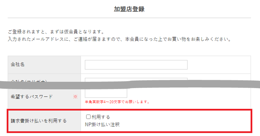加盟店の新規登録画面にて、掛け払い利用のためのチェックボックスが表示されます。
