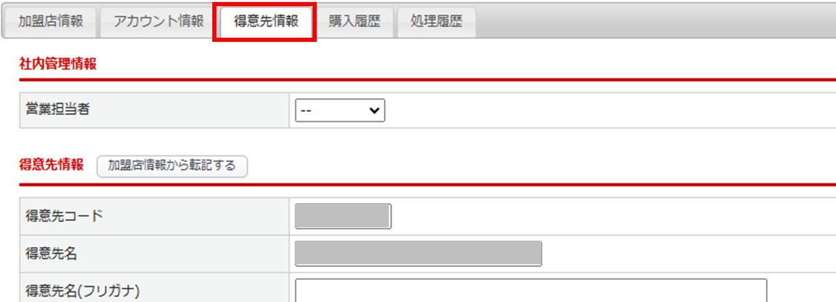 加盟店グループごとに行う場合は、加盟店 > 加盟店グループ管理 > 対象加盟店の編集画面の[得意先情報]タブから同様に行います。