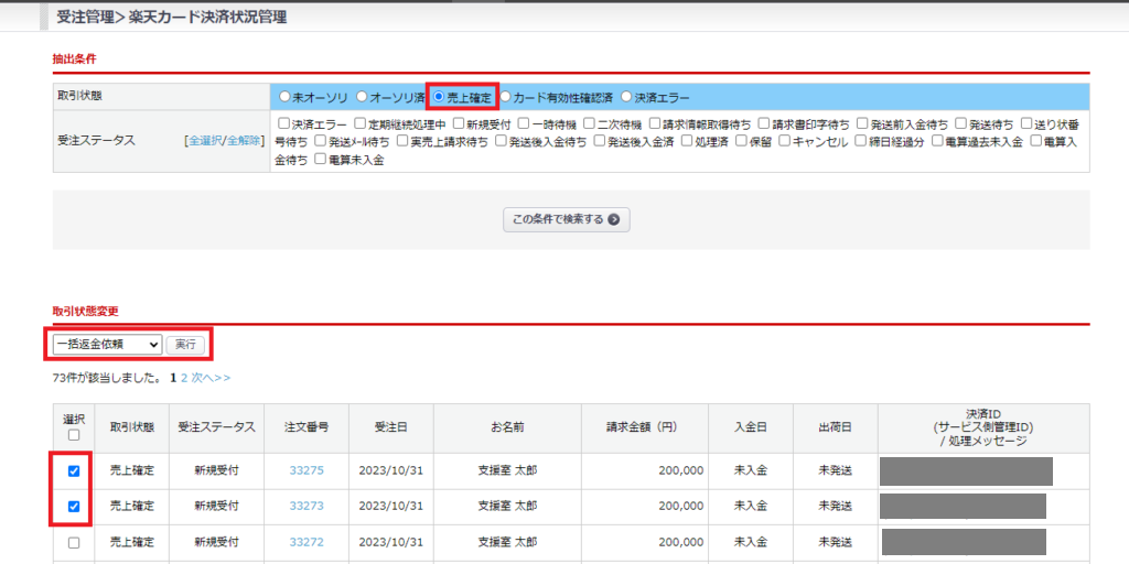 1.抽出条件より、取引状態:「オーソリ済」 を選択後、任意の受注ステータスを指定し