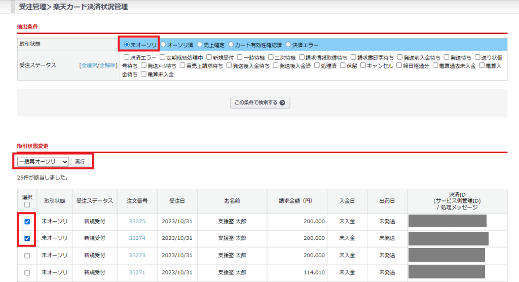 ※取引状態「未オーソリ」で抽出しなおすと該当受注が表示されることをご確認ください。