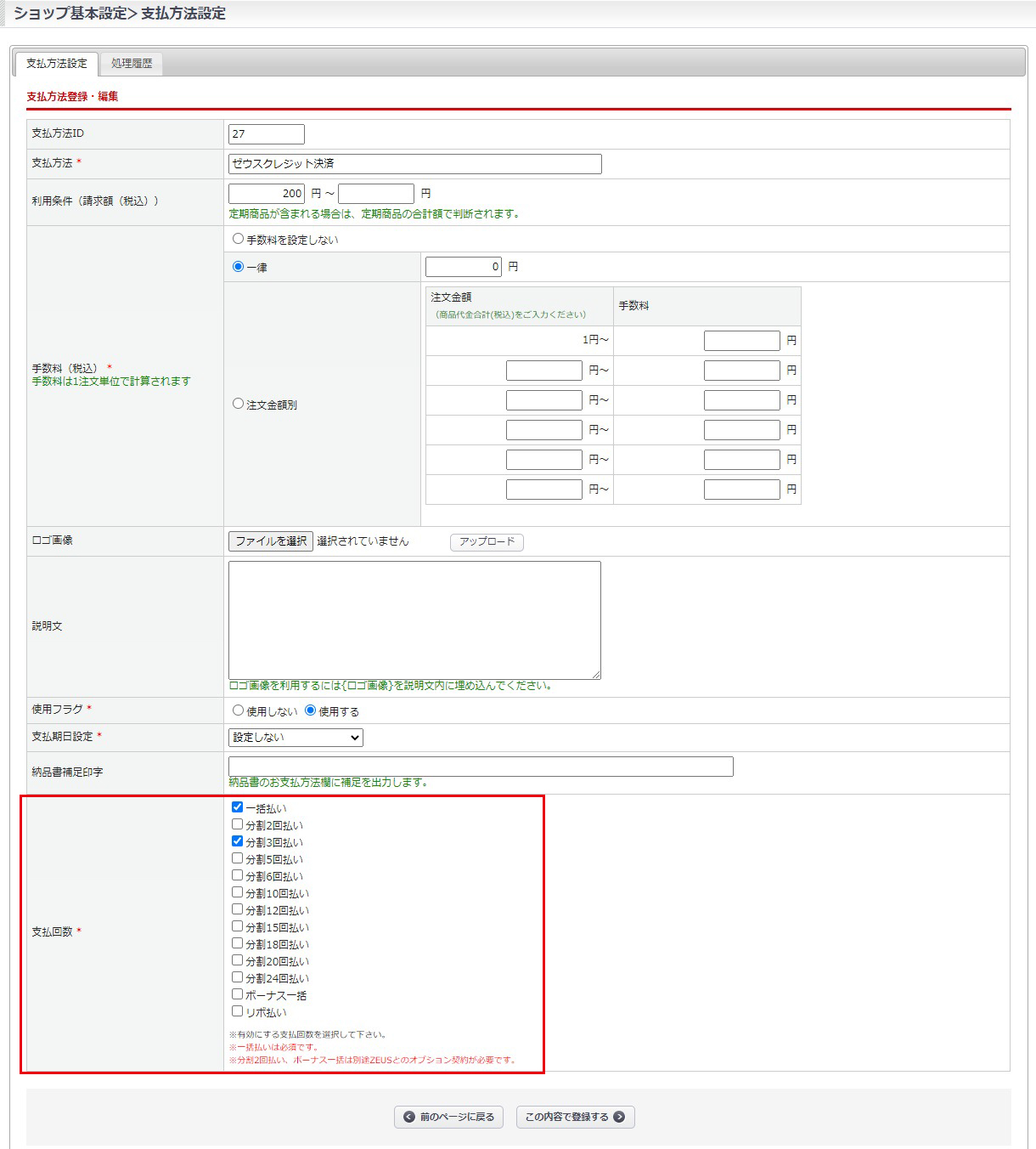 項目の [支払回数] で、有効にする回数を選択して下さい。