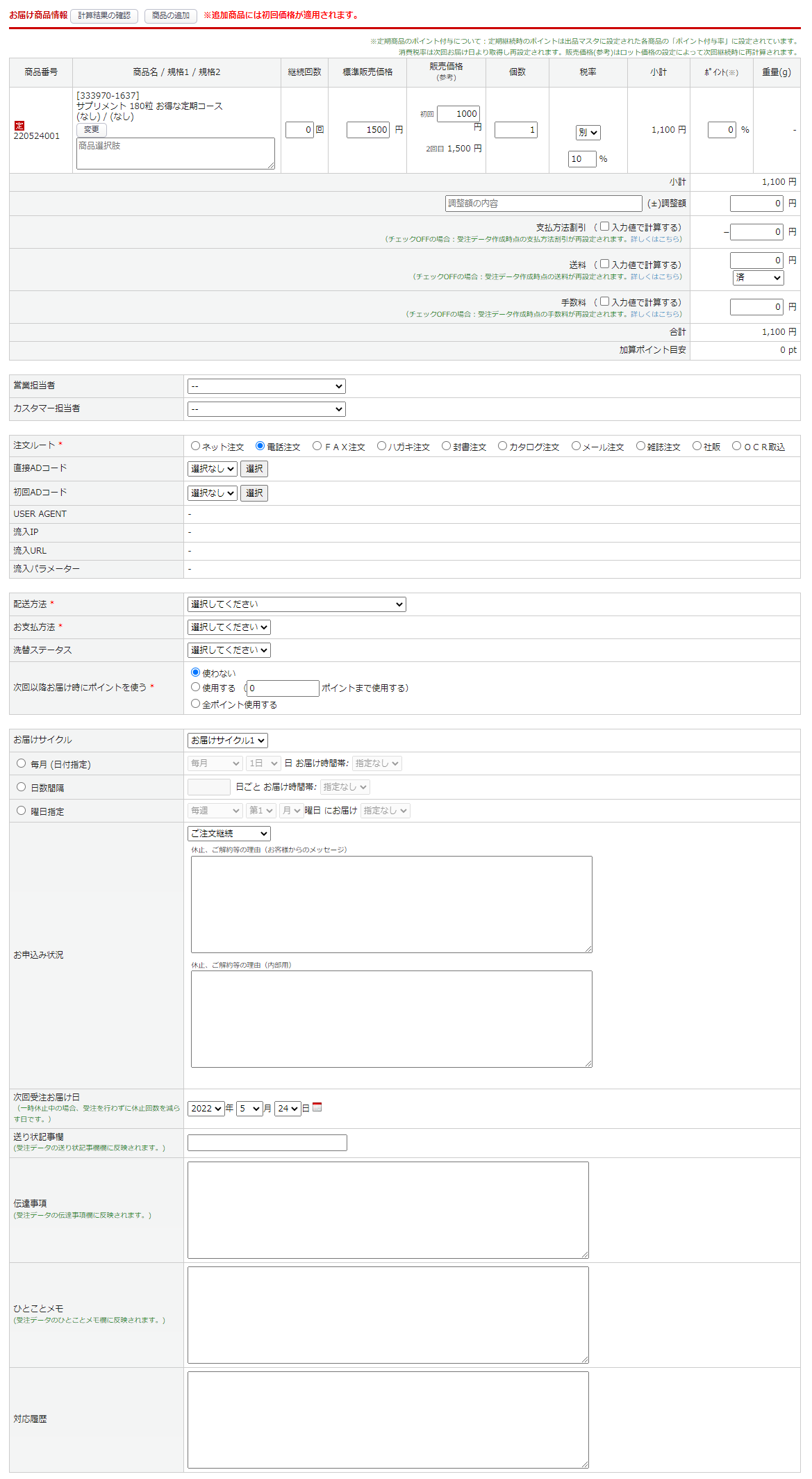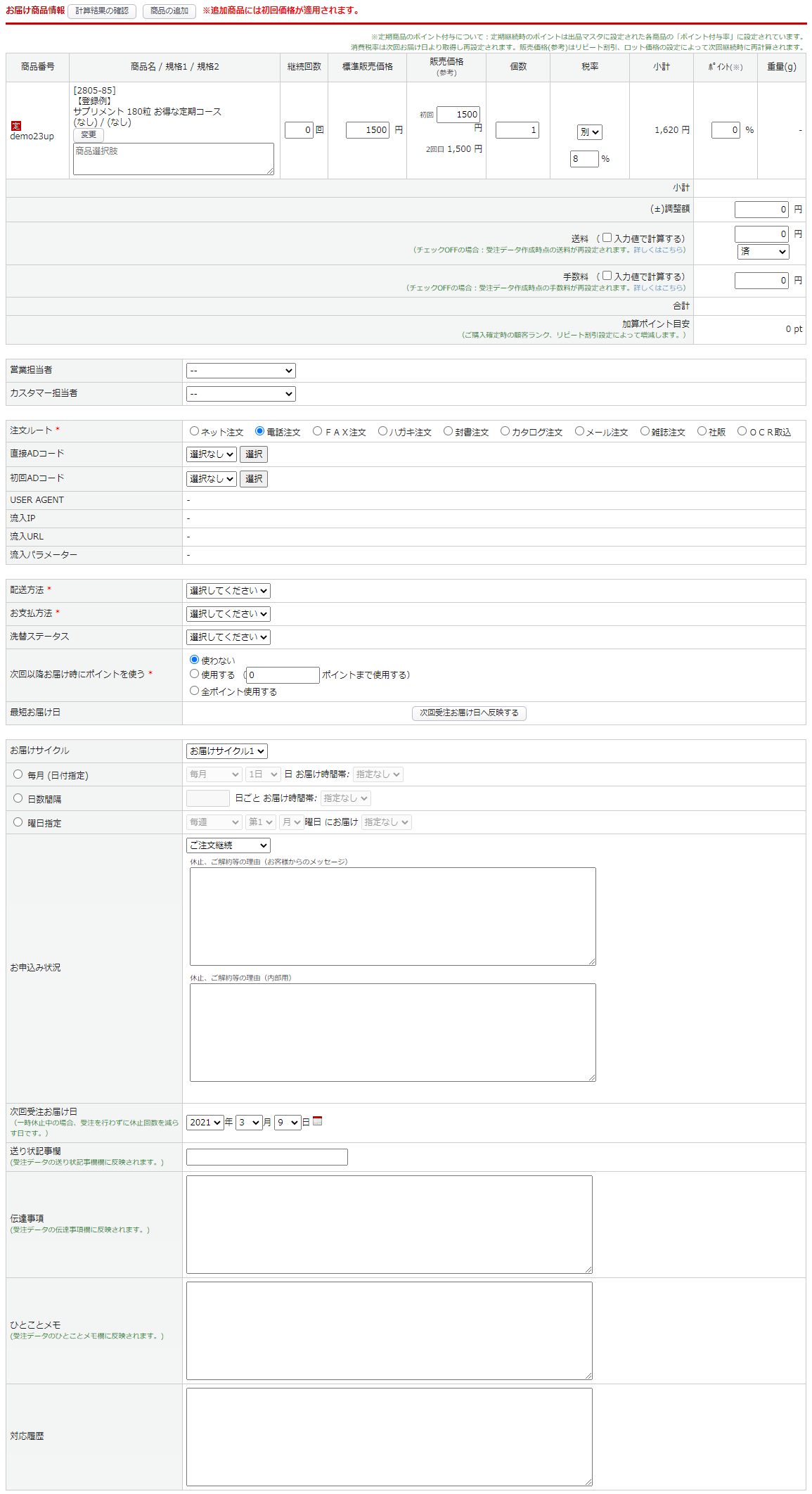| 送料 | 「入力値で計算する」にチェックが入っている場合、 次回定期継続受注データに入力した送料が反映されます。 |