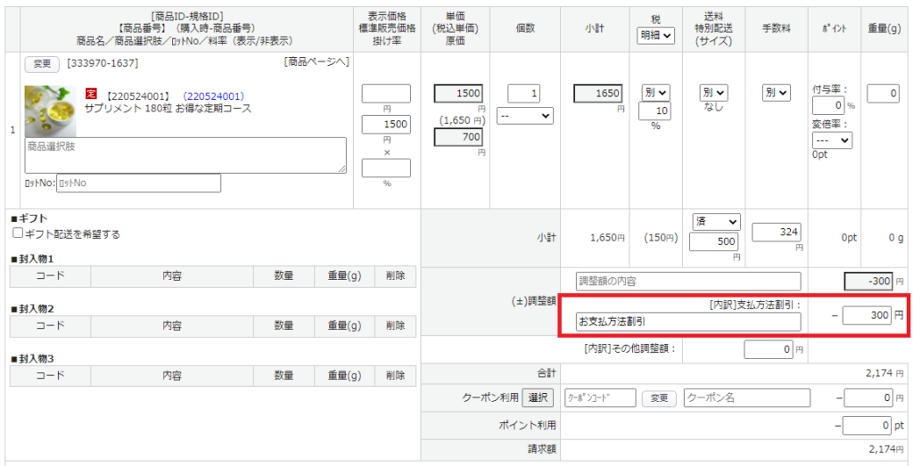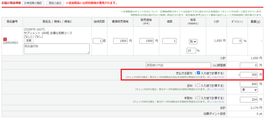 定期購入お申込み管理「支払方法割引」の「入力値で計算する」にチェック有りの場合は、