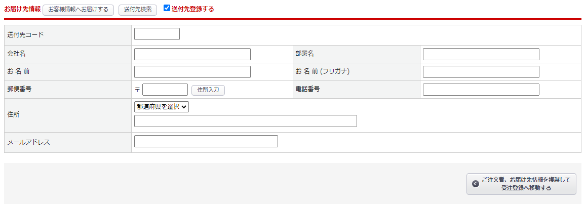 【お客様情報へお届けする】ボタンから、上記のご注文者情報で入力した同項目の値を自動設定することが可能です。
