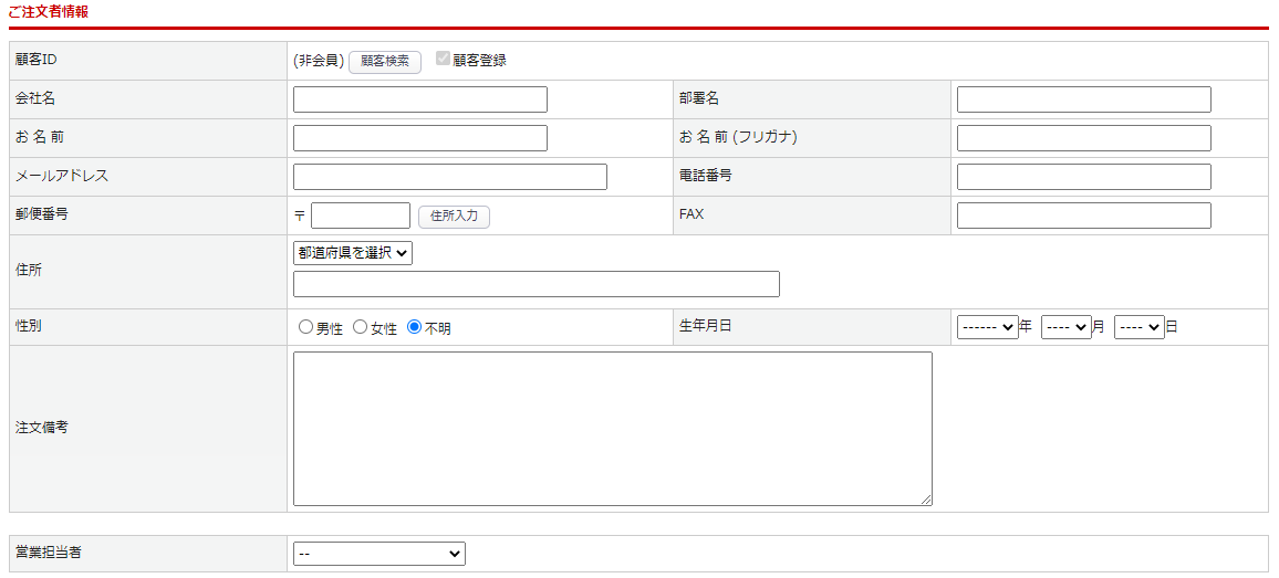 【ご注文者、お届け先情報を複製して受注登録へ移動する】ボタンでは、入力したご注文者情報と、お届け先情報を受注登録画面に複製します。その際、定期購入お申し込み画面で入力した情報は保存されません。
