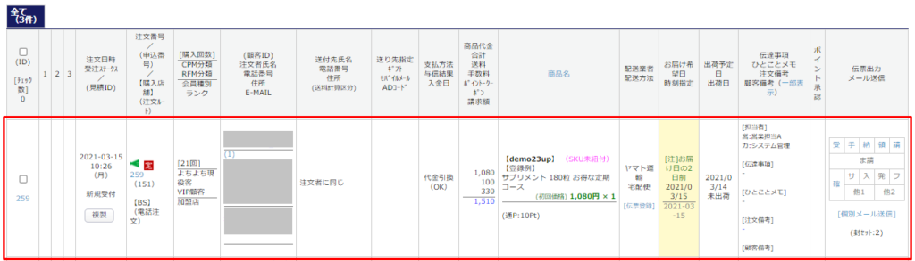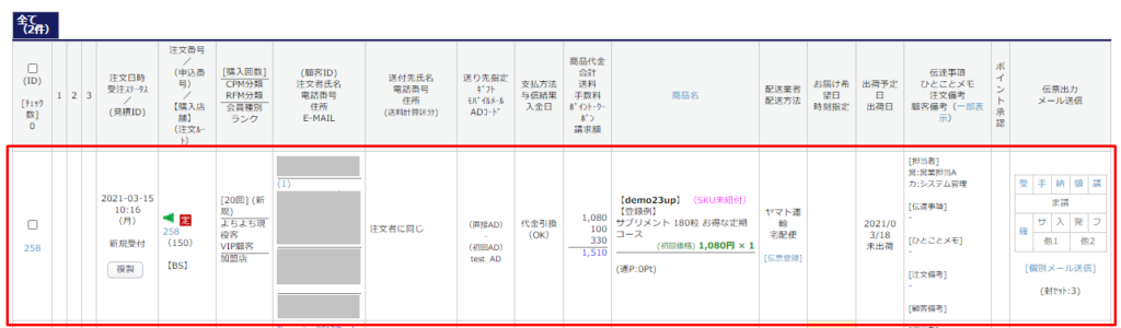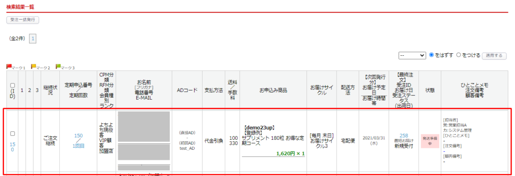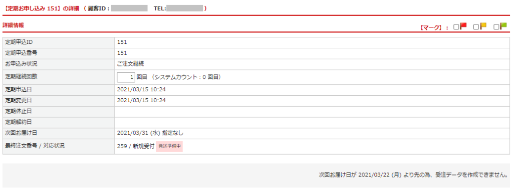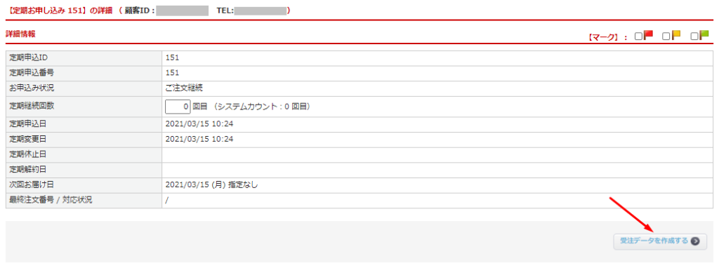 定期購入お申込み情報をもとに定期継続受注データを自動作成することが可能です。