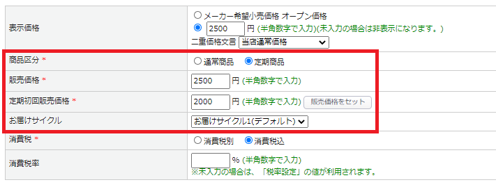 「商品区分:定期商品」を選択し、「定期初回販売価格」と「お届けサイクル」を設定します。