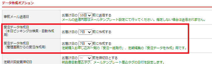 「受注データ作成日」にて、作成タイミング(お届け日の何日前)を設定します。