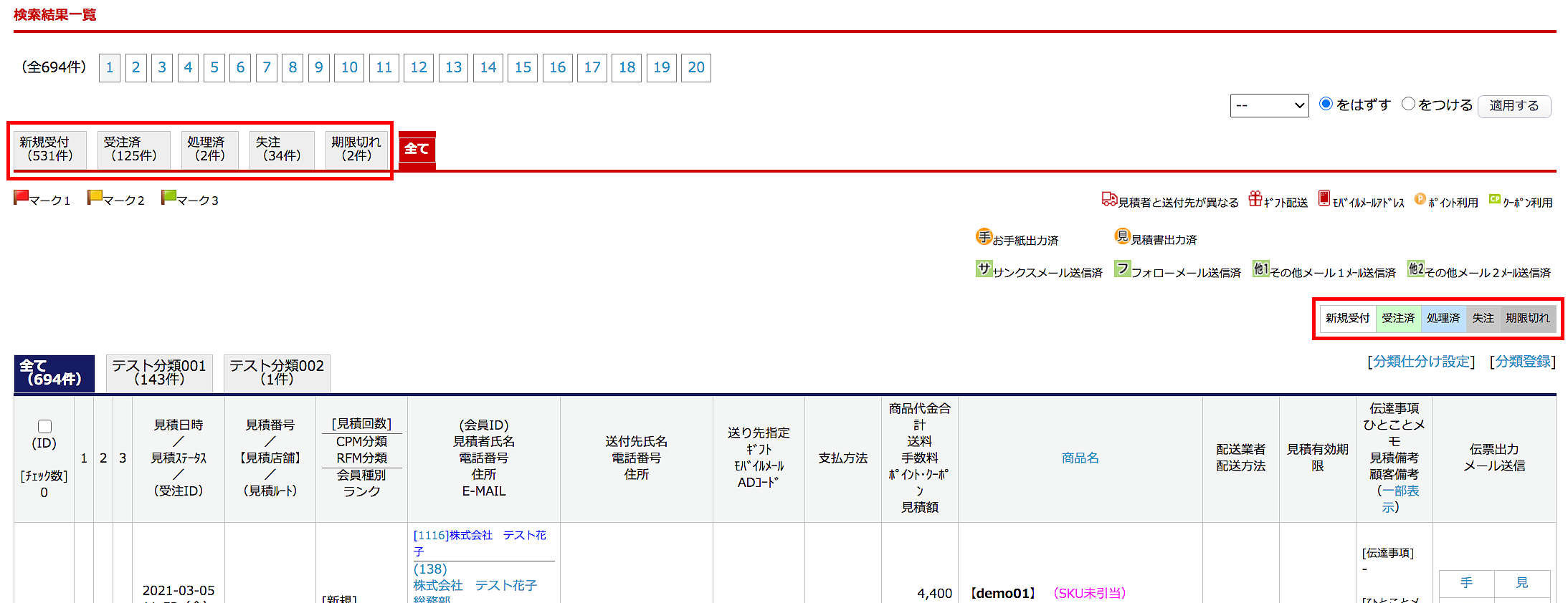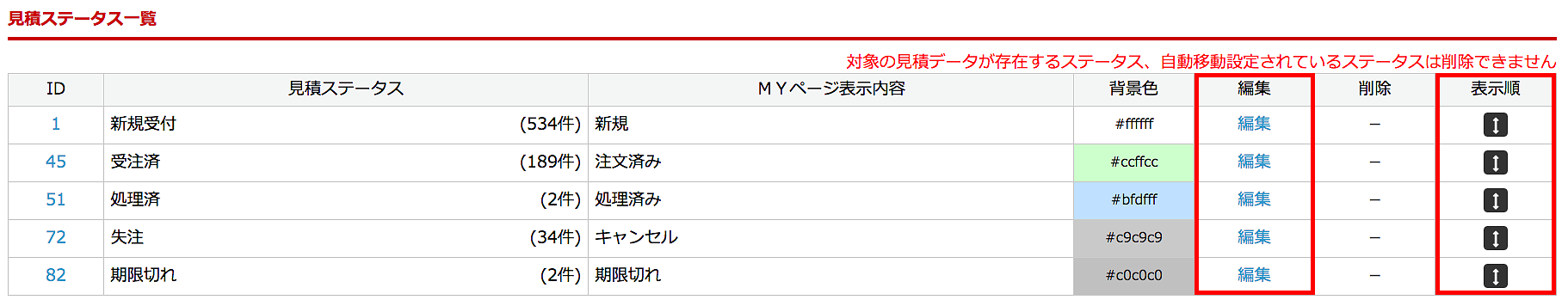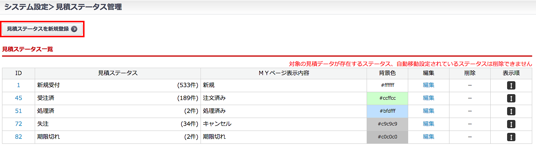 | 表示順 | 見積一覧でのステータス表示順を設定できます。 |