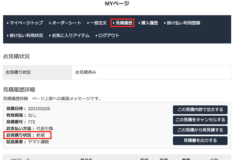 | MYページ用表示内容 | MYページ「見積履歴詳細」のお見積状況に表示される内容を設定します。![]() |