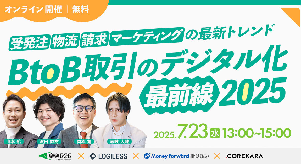 本セミナーでは、受発注・物流・請求・マーケティングというBtoB取引の主要業務を網羅し、それぞれの分野でデジタル化をけん引する4社が最新トレンドと成功事例を徹底解説。