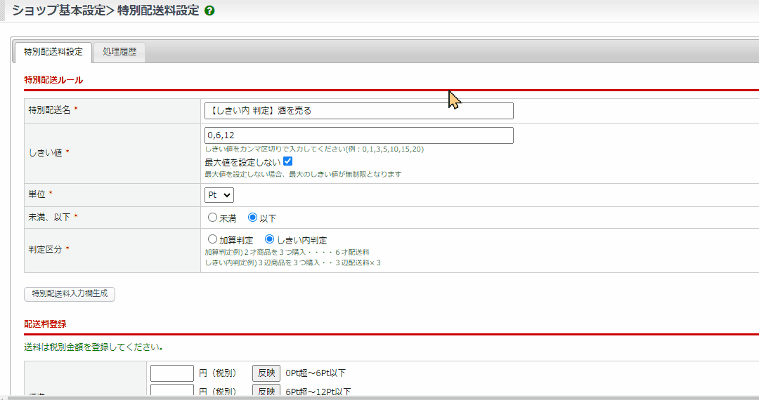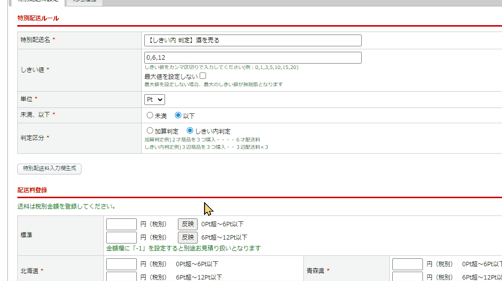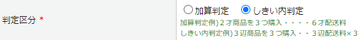 | 判定区分* | 判定区分を設定します。 ・加算判定 商品のサイズを合算して送料を算出します。 ・しきい内判定 商品毎に送料を算出します。 |