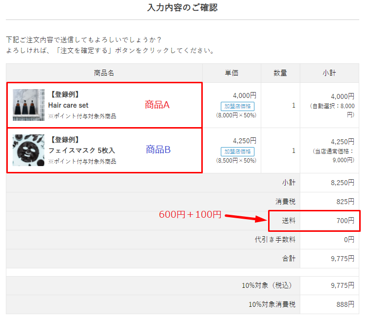 特別配送ルールが異なる商品を同時購入した場合、それぞれに設定されている特別配送料を合算した料金が送料となります。