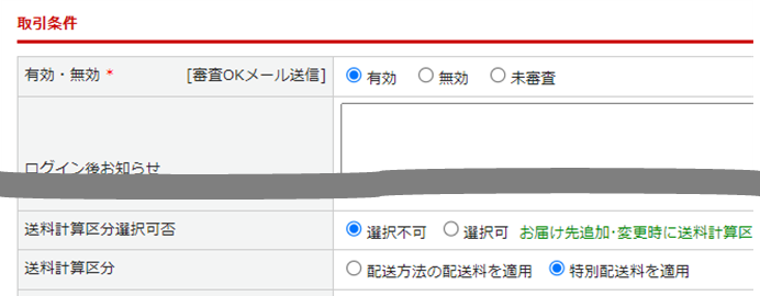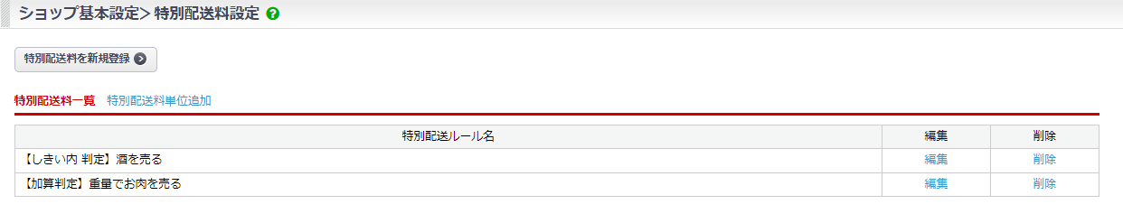 ルール詳細画面です。上で説明している<特別配送料一覧>から、「編集」ボタンをクリックすると、以下のような画面が開きます。
