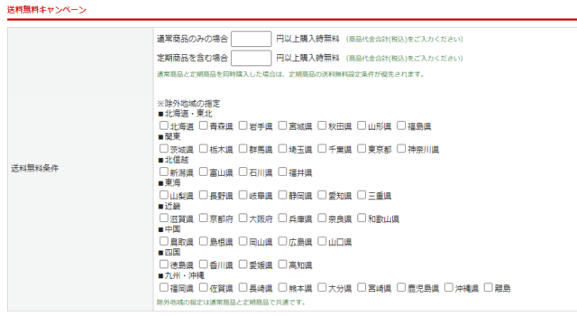 | 5 | 送料無料キャンペーン設定 | キャンペーン管理画面から設定できる送料設定です。 通常・定期商品ごとの商品代金合計(税込)を条件に送料無料設定ができます。 運営管理 > キャンペーン管理