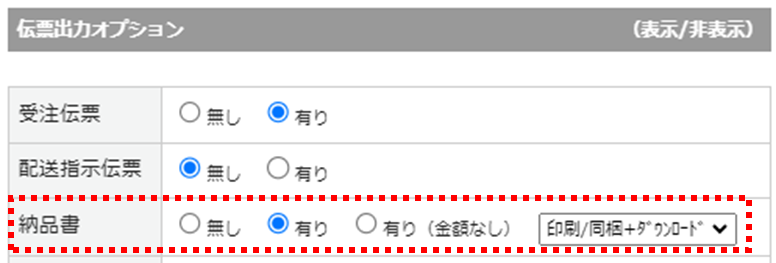 受注 > 受注一覧 > 該当受注の詳細画面にて、伝票出力オプションの納品書が「有り」と選択されている必要があります。