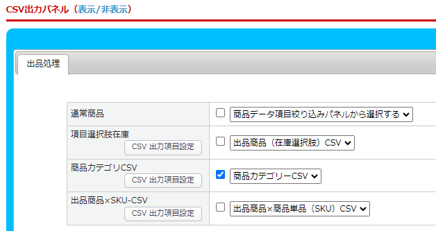CSV出力パネルから、紐づけを行いたい商品の「商品カテゴリーCSV」をダウンロードします。