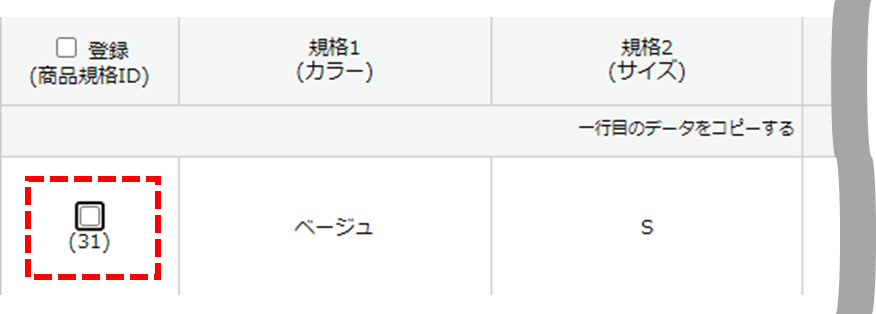 規格商品のの場合、規格別に商品コードを採番するため、リスト左端の[登録]にチェックを入れます。