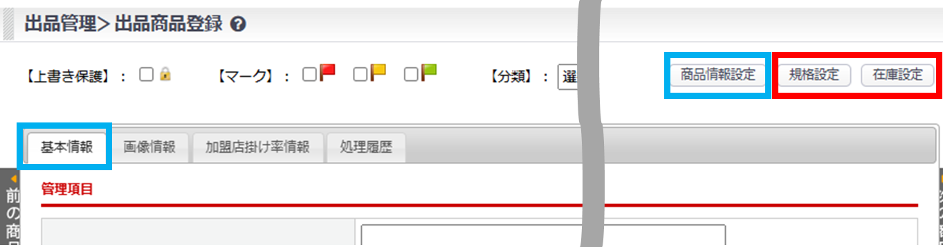 ※青枠の[商品情報設定]をクリックすると、基本情報画面に戻ります。