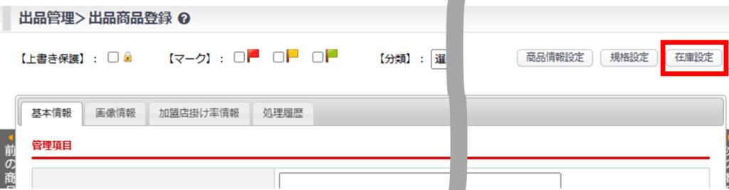 出品 > 出品商品一覧 > 対象商品の編集画面 から商品情報設定をクリックし、「在庫情報」欄までスクロールします。
