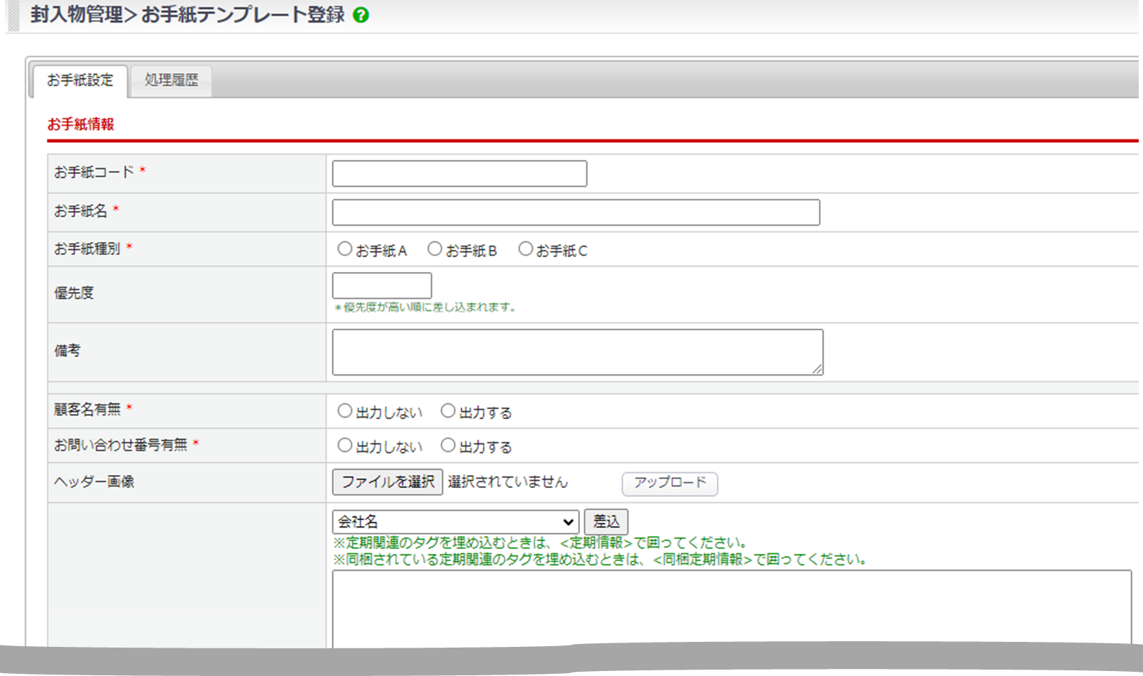 お手紙テンプレート管理用の備考を設定します。 |
