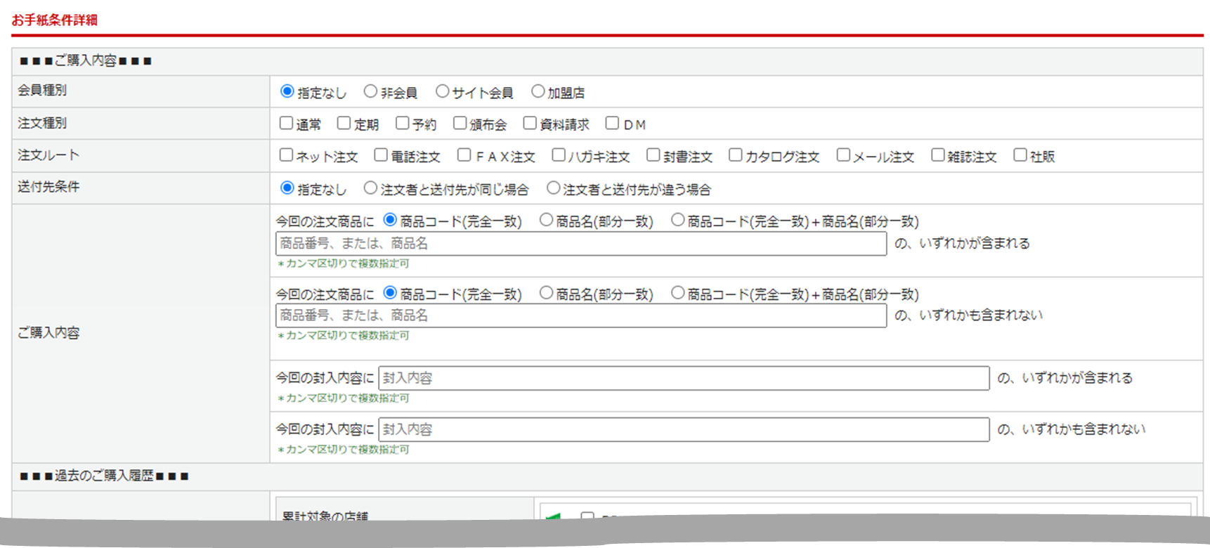 過去の未購入/未封入履歴(対象商品)による条件設定が可能です。
