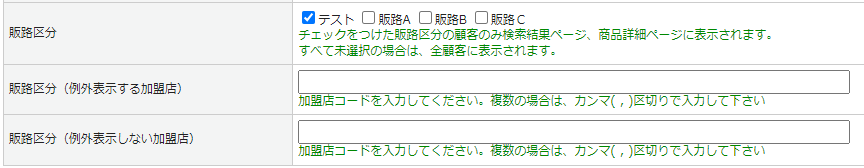 例外的に表示する加盟店の加盟店コードを入力してください。複数の場合は、カンマ( , )区切りで入力してください。 - 販路区分(例外表示しない加盟店)